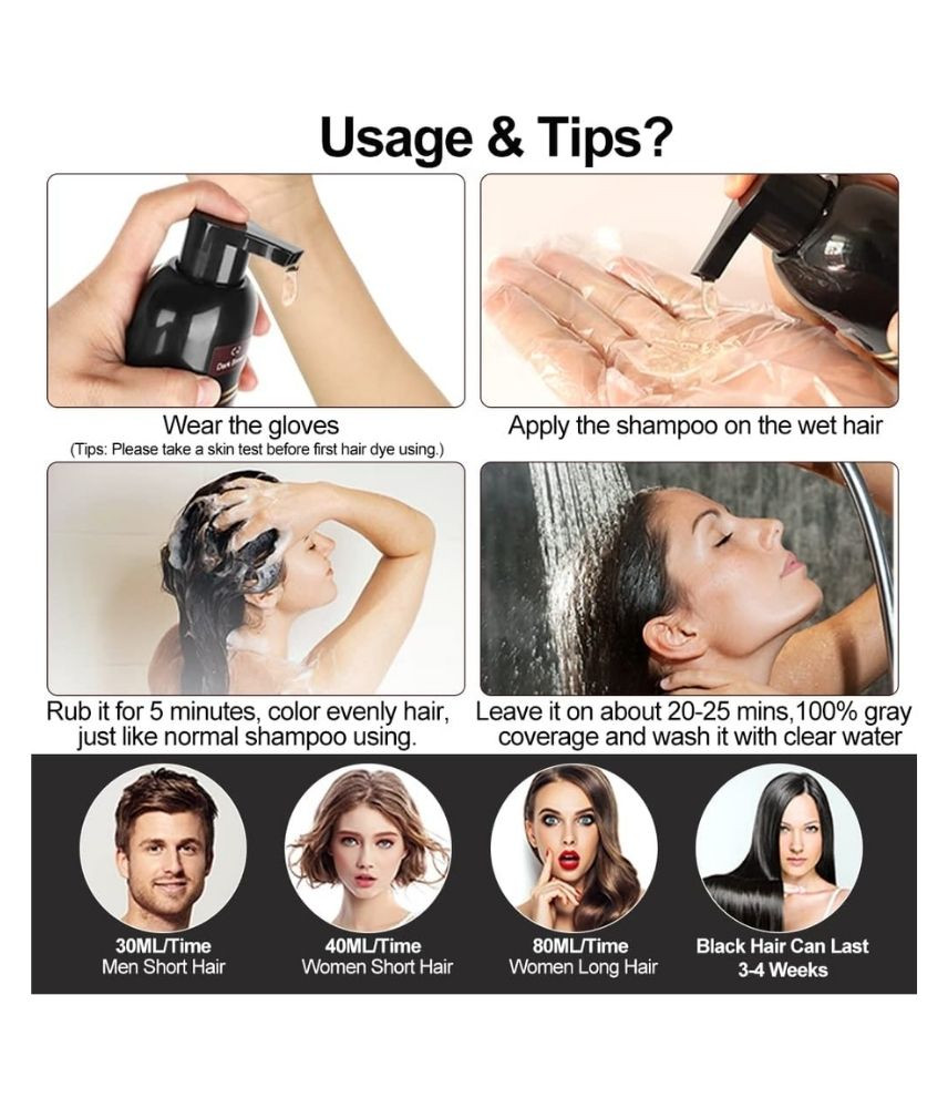 سهل الاستخدام: لا يتطلب وعاء أو فرشاة، فقط عليك ارتداء القفازات، واستخدامه مثل الشامبو العادي، انتظر لمدة 8-10 دقائق فقط، شامبو صبغ الشعر الخاص بنا للنساء والرجال سيغطي كل شعرك الرمادي! لا تلوث بشرتك.