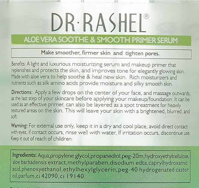 ** مرحبًا بصديقك الجديد المفضل لبشرتك - مصل البرايمر المهدئ والمنعم من دكتور راشيل! هذا المنتج الرائع مليء بالصبار المغذي، وهو مصمم للحفاظ على بشرتك منتعشة ومتجددة. سواء كنت تبدأ يومك أو تستعد لقضاء ليلة في الخارج، فإن بضع قطرات فقط من هذا المصل ستجعل بشرتك تشعر بالنعومة واللمعان وجاهزة للمكياج. امنع مكياجك من أن يصبح متكتلًا أو متقشرًا، مع هذا المصل الهادئ الذي يوفر قماشًا مثاليًا لتطبيق مكياج خالٍ من العيوب. سهل الاستخدام، وصديق لبشرتك، هذا المصل يجب أن يجربه عشاق العناية بالبشرة. **