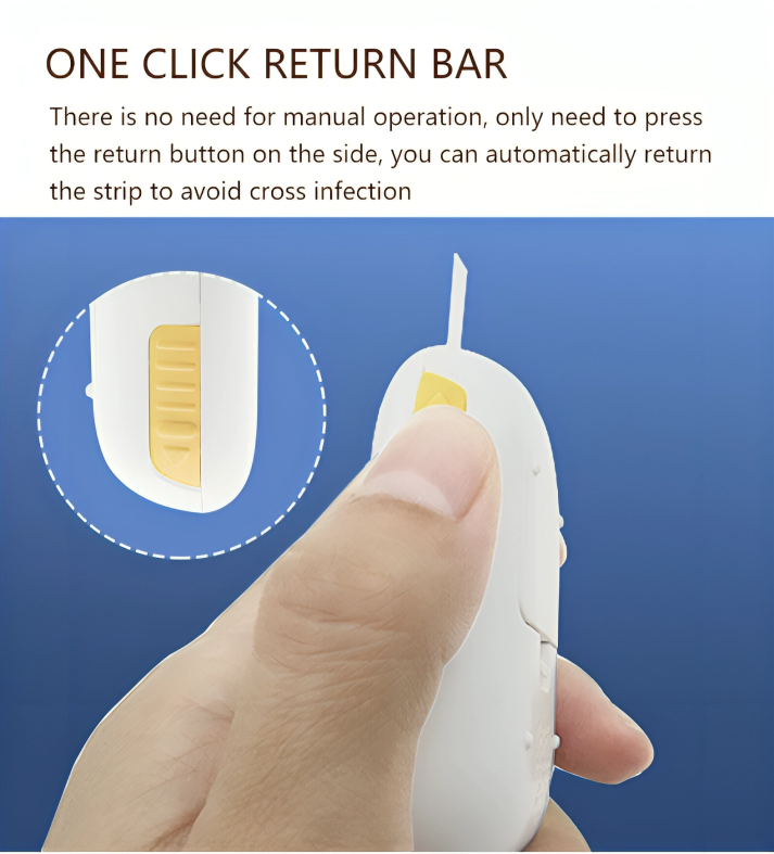 طريقة العمل: وضع شريط الاختبار في الجهاز، ثم وخز الإصبع وأخذ نقطة دم صغيرة على الشريط لعرض النتيجة.