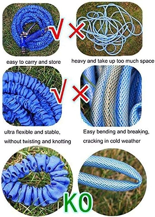 الخرطوم يتمدد بفعل ضغط مضخة الماء الى ثلاثة اضعاف طوله الطبيعي ومن ثم يتقلص بمجرد تفريغه من الماء قوي ومتين و يتحمل حرارة الشمس خفيف الوزن ولا ينثني او يلتوي مزود برشاش ماء بثمانية اوضاع للرش