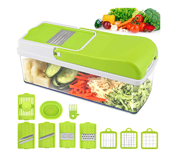 1. متعددة الاستخدامات: تتضمن قطاعة الخضار 8 قطع مختلفة قابلة للتبديل، مما يسمح لك بتقطيع، تقطيع أو تحويل الخضار والفواكه بأنماط متعددة بسهولة.