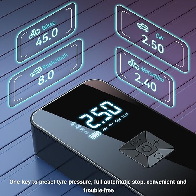 [إيقاف التشغيل التلقائي]: استخدم زري التحكم "+" و"-" لاختيار الضغط المرغوب فيه بسهولة، ما عليك سوى توصيل خرطوم الهواء بسيارتك والضغط على زر "البدء" الأوسط الموجود على مضخة الهواء الكهربائية. بمجرد الوصول إلى الضغط الصحيح، سيتم إيقاف تشغيل مضخة الهواء المحمولة تلقائيًا. لا مزيد من النفخ الزائد، فهو بسيط وآمن.