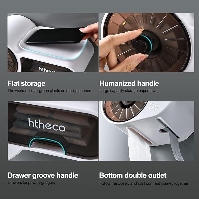 تكون النوافذ الشفافة مرئية للتحقق من الكمية المتبقية من الورق مع تصميم مشبك لإضافة الورق أو إعادة تعبئته أو استبداله. أنبوب قابل للفصل يجعل الحامل يمكنه تخزين أنواع مختلفة من الورق الملفوف