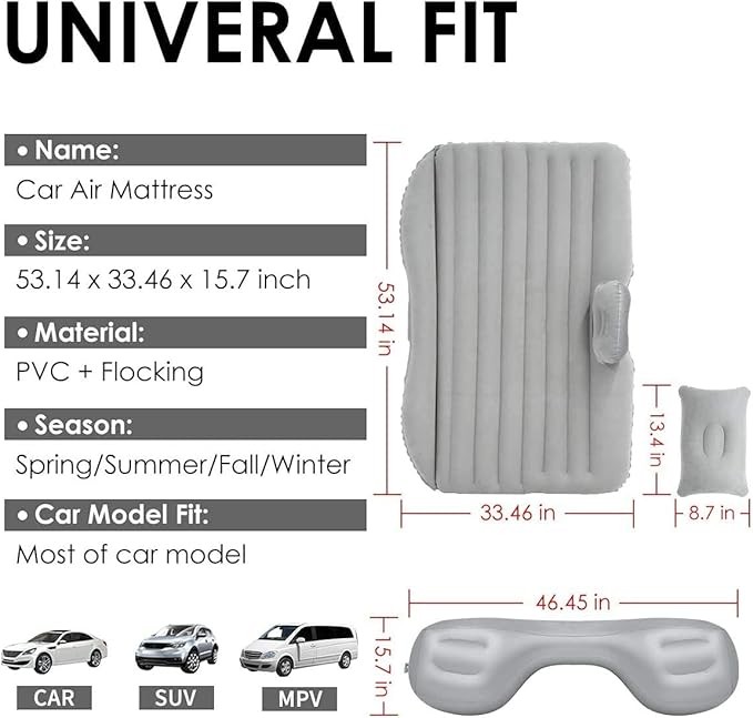مريحة: مرتبة السيارة القابلة للنفخ مسطحة وواسعة ومريحة، مما يوفر لأطفالك أو أحبائك نومًا مريحًا للغاية أثناء السفر ووقتًا مريحًا أثناء الرحلة. اختيار جيد للكراسي الخارجية وكرسي الشاطئ.