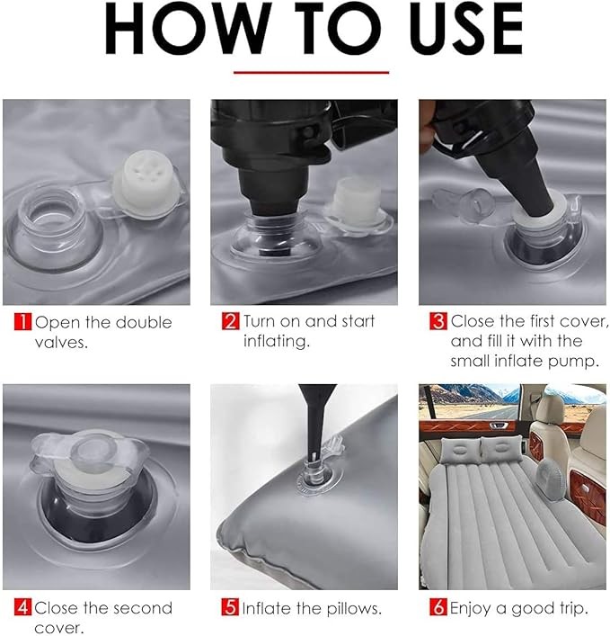 سهلة الحمل والاستخدام: مرتبة المقعد الخلفي القابلة للنفخ تناسب السيارة تمامًا، بمجرد توصيل المضخة الكهربائية بمقبس ولاعة السيارة، ستكمل النفخ السريع والسهل في دقيقتين
