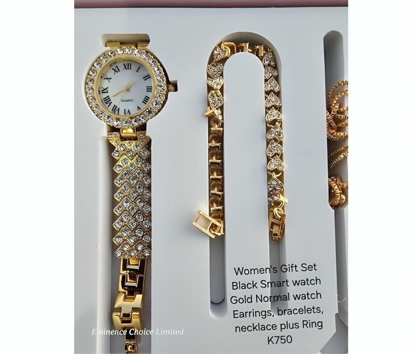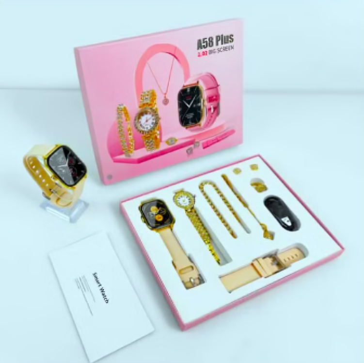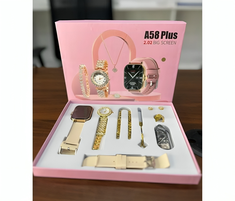 مجموعة كاملة 7 في 1: ساعة ذكية مع حزامين، أقراط، أساور، وقلائد تجمع بين الأناقة والتكنولوجيا.