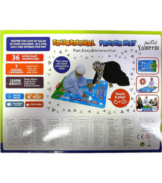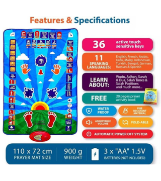 تقدم السجادة صلاة تجمع بين المتعة والتعلم، حيث يتم تصميمها بطريقة تجعل عملية تعلم أداء الصلاة مثيرة وجذابة للأطفال. يتم دمج 15 لغة مختلفة لتوفير تجربة لغوية وتعليمية متعددة.