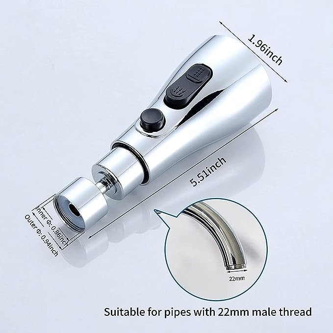 4. **سهولة التركيب:** يتميز بموصل قياسي بقطر 22 مم، مما يجعله مناسبًا لمعظم أنواع الصنابير المنزلية. يمكن تركيبه بسرعة وسهولة بدون الحاجة إلى أدوات. تصميمه من مواد عالية الجودة مثل النحاس ومادة ABS يجعله متينًا ومقاومًا للصدأ.